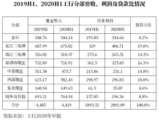 细拆今年银行中报,我们发现一个有趣的现象:各家银行利润下滑主要是由于总行层面业绩拖累所致。以工行为例,其贷款相对均匀地分布在各大区域分行,2020年主要分部营收均为正增长,总行以外营业利润也大都有所增长,但是2020H1合计营业利润下滑198.58亿元,其中70%为总行拖累,而总行的贷款占比仅为4.2%。