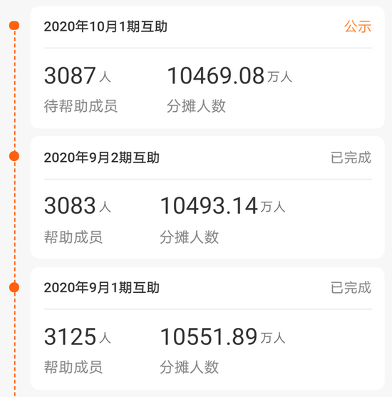其中,大病互助(平台目前共4个互助项目)是退出的“重灾区”:9月第1期,2336人需要帮助,10127.9万人参与分摊,到10月第1期,2303人需要帮助,参与分摊的人数则降了79.2万人。