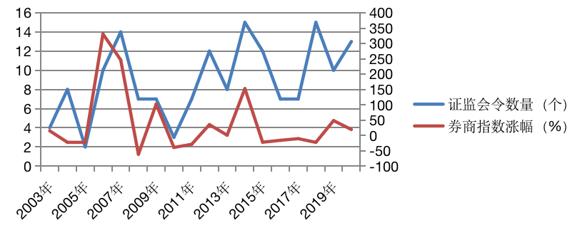 附图2003年以来每年政策数量与券商指数涨幅对比