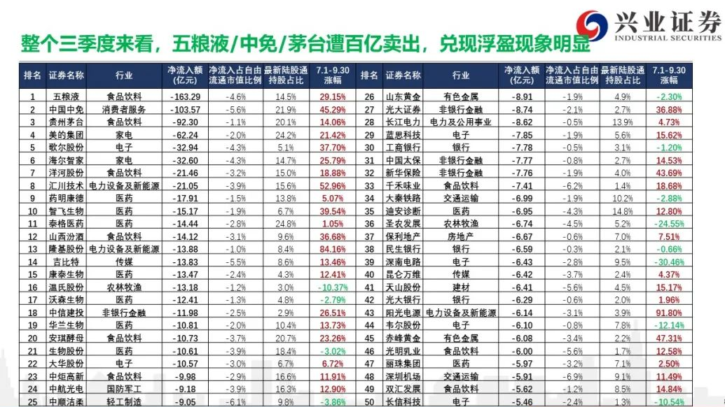 具体来看,8、9月份五粮液、中国中免、贵州茅台净流出位居前三,均达到百亿级别,其中五粮液被净卖出163.29亿元、中国中免被净卖出103.57亿元、贵州茅台被净卖出92.3亿元。美的集团、歌尔股份、海尔智家、洋河股份、汇川技术等也净卖出超20亿元。