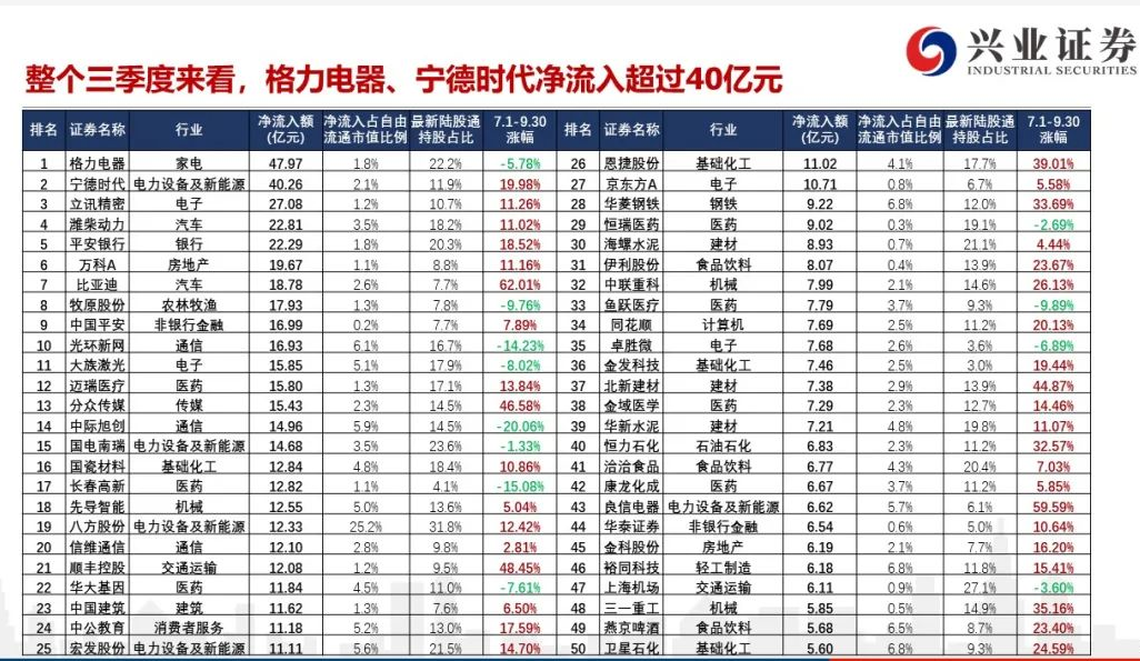 当然,还是有些股票在三季度依然获得净买入。格力电器、宁德时代被净买入居前,都达到40亿元以上,分别为47.97亿元、40.26亿元,立讯精密、潍柴动力、平安银行等也获净买入超20亿元。