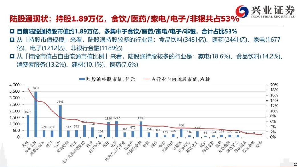 陆股通持股多集中在食品饮料、医药、家电、电子、非银五个板块,5个板块持股市值合计占到53%。其中食品饮料持股3481亿元、医药持股2441亿元、家电持股1677亿元、电子持股1212亿元、非银持股1189亿元。