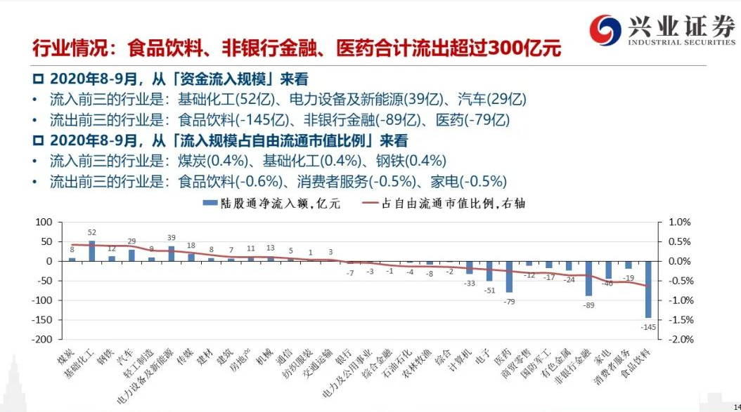 从行业来看,8、9月份,陆股通外资在食品饮料、非银金融、医药板块分别净流出145亿元、89亿元、79亿元,合计净卖出超过300亿元。净流入前三的行业则是基础化工(52亿)、电力设备及新能源(39亿)、汽车(29亿)。
