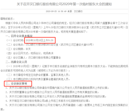 券商中国记者获悉,汉口银行此前发布的《2020年第一次临时股东大会的通知》显示,汉口银行定于10月10日上午9点30分在汉口银行大楼28楼召开该行2020年第一次临时股东大会,将审议“汉口银行申请在境内上市”、“授权董事会全权办理上市”等各项事宜。