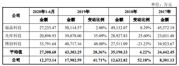 对比公司招股书中选取的上市公司福晶科技(002222.SZ)、光库科技(300620.SZ)、博创科技(300548.SZ),根据三家公司年报披露,2019年福晶科技营业收入为5.01亿元,同比增长2%,净利润1.35亿元,同比下滑10.57%;光库科技的营业收入为3.91亿元,同比增长35.09%,净利润为5748.42万元,同比下滑28.07%;博创科技营业收入为4.07亿元,同比增长48.00%,净利润为778.36万元,同比增长233.91%。