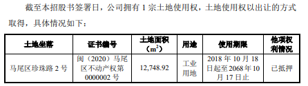招股书披露,腾景科技位于福州马尾区珍珠路2号的工业用土地使用权已抵押,该抵押物为公司所拥有的唯一的土地使用权,且为本次发行的募投项目用地,属于公司持续经营的关键性资产。