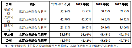 2017年至2020年上半年,同行业可比公司的主营业务综合毛利率平均值分别为47.17%、45.48%、38.60%及38.95%,与腾景科技毛利率相差不大。