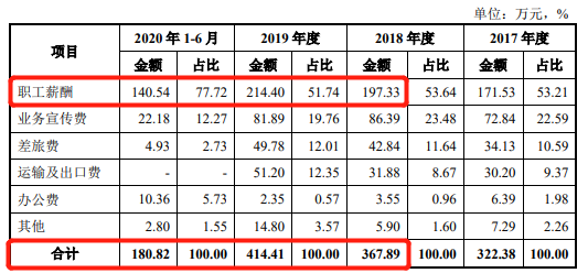 根据招股书,2019年,腾景科技的销售费用为414.41万元,比上年增加46.52万元,同比增长12.64%。其中,公司的人员薪酬增加了17.07万元,同比增长8.65%。