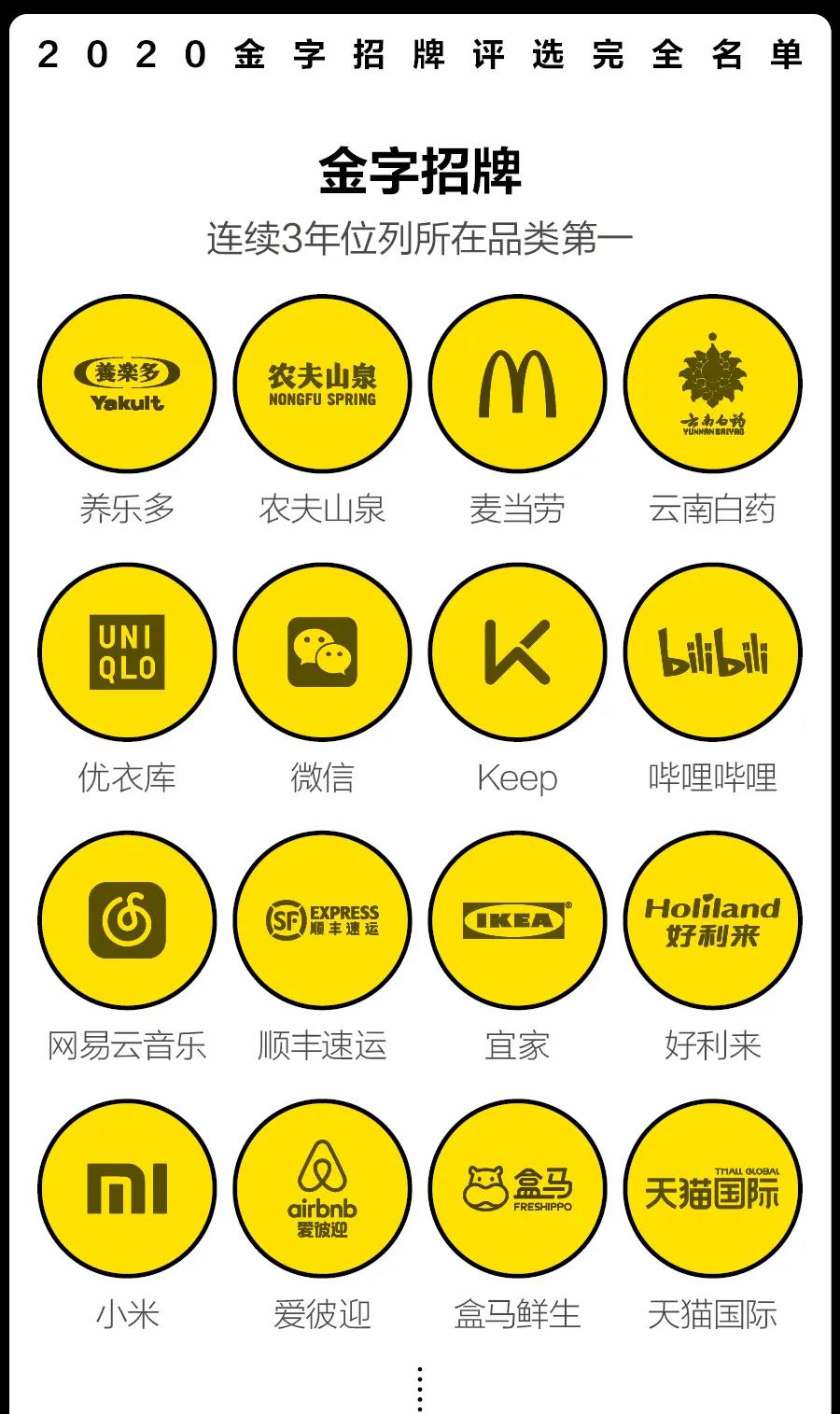 从调研结果我们发现,改变确实发生了。今年,有16个品牌因连续3年在所在品类获得消费者喜爱度第一而成为金字招牌,它们是养乐多、农夫山泉、麦当劳、云南白药、优衣库、微信、Keep、哔哩哔哩、网易云音乐、顺丰、宜家、好利来、小米,爱彼迎(Airbnb)、盒马鲜生和天猫国际。