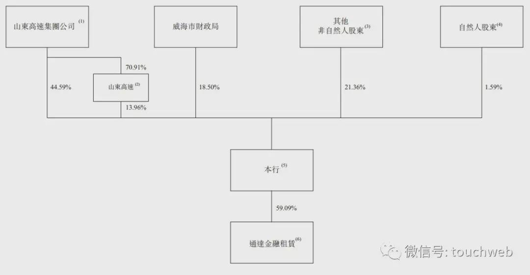由于山东高速集团公司最终拥有山东高速70.91%股本,因此为山东高速的控股股东。山东高速直接持有威海银行13.96%股本,因此,山东高速集团公司直接及间接持有威海银行约58.54%股本。