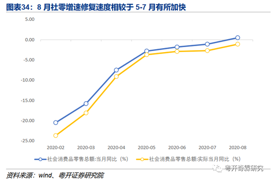 8月社零当月同比为0.5%,是2020年的首次转正,基本符合Wind一致预期(0.57%)。
