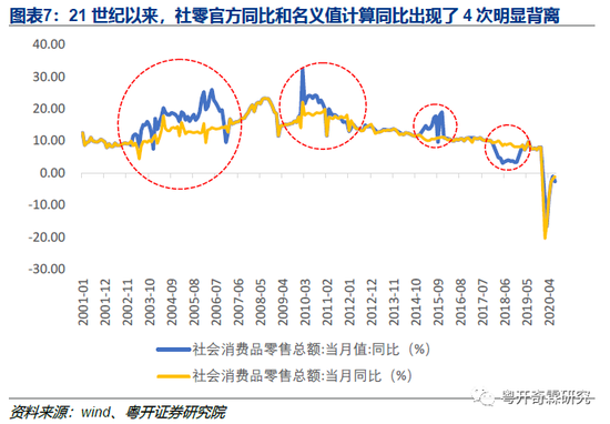 就名义同比而言,用社零绝对值计算同比,大多数时候和官方公布的同比一致,但在部分时间段会出现存在差异。自21世纪以来,差异主要出现在2003-2006年,2010年、2015年还有2018年。