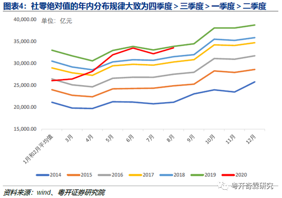 观察社零绝对值的年内变动趋势,可以发现一般四季度>三季度>一季度>二季度,下半年的情况要好于上半年。