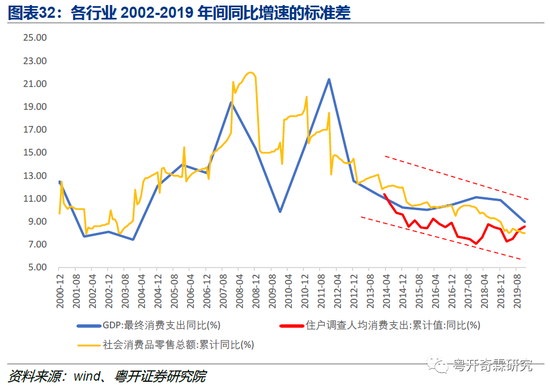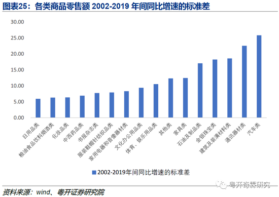 用2002-2019年间,各类商品同比增速的标准差来量化其波动性,可以发现日用品、食品饮料、中西药品等商品的波动性都相对较小,这些都是比较典型的必选消费品。