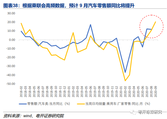 从汽车消费来看,乘联会高频数据显示9月汽车消费继续好转,这意味着9月汽车零售额同比增速大概率将提升。