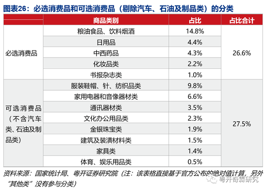 我们把粮油食品类、服装类商品、其他12类商品一同纳入考量,并将它们继续分为必选消费和可选消费两个部分。