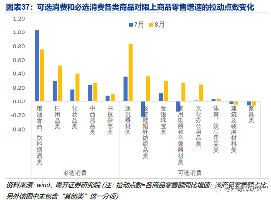 除了食品饮料类零售额以外,中西药品、日用品、化妆品等其他必选消费,对限额以上商品零售增速的拉动都有所提升,但作用也都相对有限。