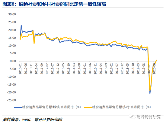 总的来说,城镇社零和乡村社零的同比变动走势接近一致,我们一般也不从城乡角度分析。