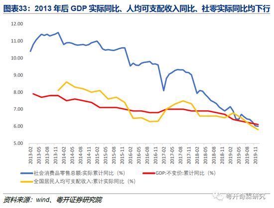 综上,三大消费指标均显示出,近年来中国消费状况较为低迷。这一点完全可以从最简单的角度理解——伴随着中国经济承压趋缓,人均可支配收入增速下行,消费增速自然也受到了压制。