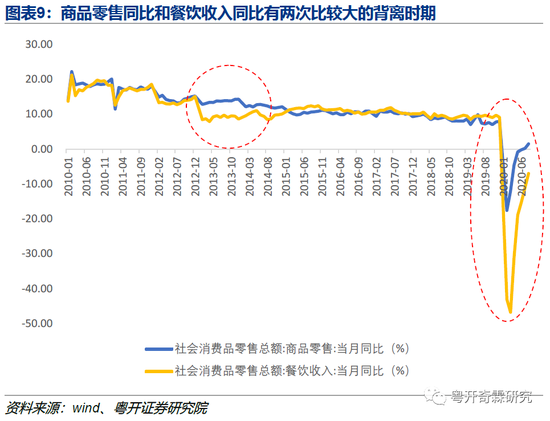 从同比来看,商品零售和餐饮收入有两个比较明显的走势背离时期。
