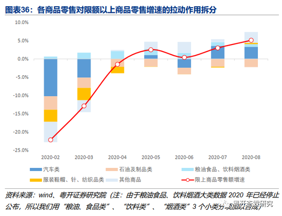 8月限上商品零售同比增速为5.1%,较前值提升2.1个百分点。参考第2章方法,将2020年前8个月的限上商品零售增速分解为5个部分:汽车类、石油及制品类、食品饮料类、服装类还有其他12类商品。
