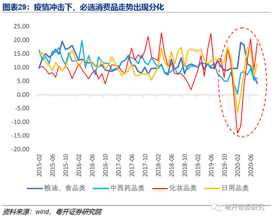 1)化妆品、日用品受疫情冲击较大,但是反弹也非常迅速,目前两者的同比基本已经回到疫情前水平。