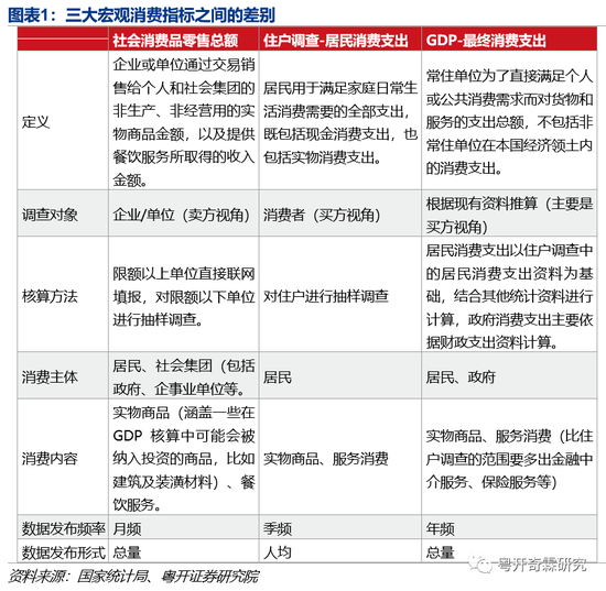 从消费主体来看,社零的统计范围最宽泛,包括了居民和所有社会集团消费。而住户调查口径只统计了居民消费,GDP口径包括政府消费和居民消费。