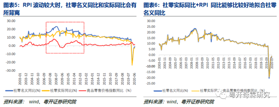 当RPI同比出现较大波动时,比如2007-2011年,名义同比和实际同比走势会出现背离。而如果RPI同比保持平稳,那么两者的走势差别基本不大。