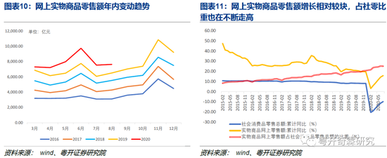 这也使得实物商品零售额占社零比重在不断走高,从2015年初的8.3%左右,一路提升到2020年中的25%左右。数据比较符合我们对于这几年来网络电商和线上购物迅猛发展的的直观感受。