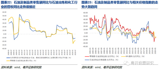 石油制品类零售在今年一直是拖累项。尽管随着2-4月复产复工,石油及制品类零售增速有所好转,但受今年油价持续低迷影响,在4-8月,它始终稳定在-13%到-14%左右的低位。