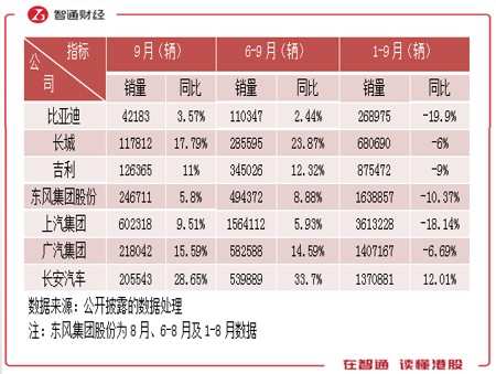 长城汽车稳坐自主品牌龙二位置,在车市及资本市场的表现都非常吸睛,股价6个月翻倍,销量强势增长,其中皮卡表现最亮眼,9月及首9个月销量分别增长67.29%和63.17%,贡献了主要增长业绩。而比亚迪继续保持新能源汽车品牌龙头地位,于9月实现新能源汽车销量19881辆,同比增长45.3%,“汉”“唐”旗舰电动车销售超预期。