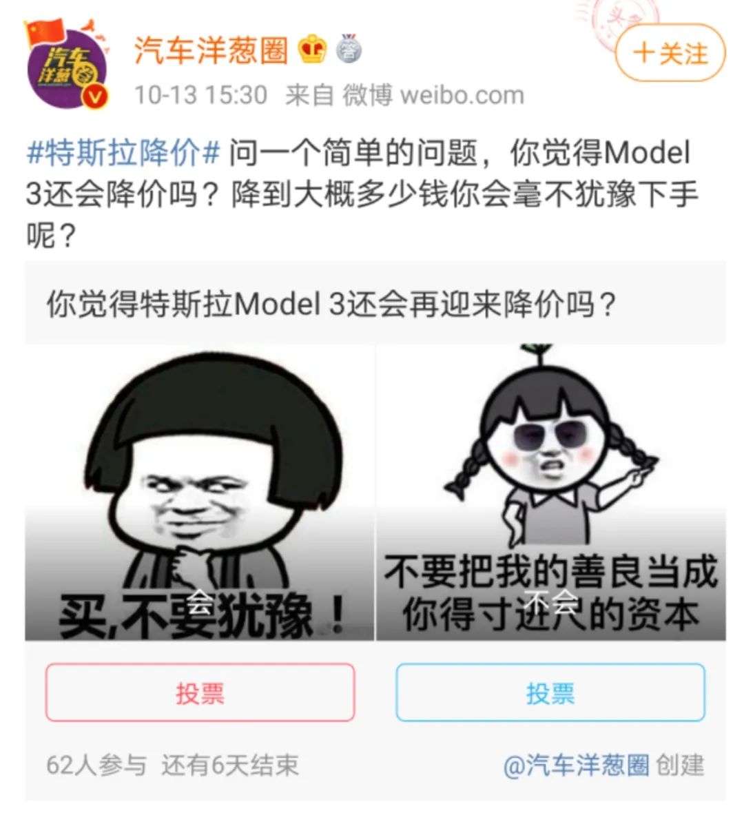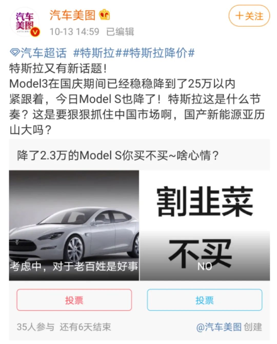 就在今日特斯拉Model S官网降价之后,微博自媒体“汽车洋葱圈”和“汽车美图”分别发布了两份调查,也能够体现出两类消费者的不同心理。