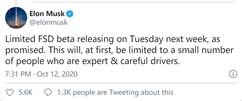 另外,据媒体报道,埃隆·马斯克在推特上表示,限量FSD测试版将于下周二推出,不过该测试版只面向“专业而谨慎的驾驶员”。此前马斯克表示,特斯拉将在未来几周发布限量全自动驾驶测试版,使其电动汽车能够实现“零干预驾驶”。特斯拉的自动驾驶系统FSD将在限量全自动驾驶测试版发布后进行新更新。上个月,马斯克表示,将首先推出私人测试,然后是公开测试,预计在12月中旬将全面向所有美国车主推出。