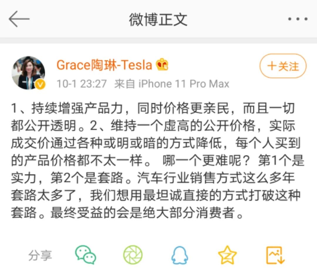 另外,特斯拉对外事务副总裁陶琳也多次在微博上对降价问题作出回应。陶琳表示:“1、持续增强产品力,同时价格更亲民,而且一切都公开透明。2、维持一个虚高的公开价格,实际成交价通过各种或明或暗的方式降低,每个人买到的产品价格都不太一样。哪一个更难呢?第1个是实力,第2个是套路。汽车行业销售方式这么多年套路太多了,我们想用最坦诚直接的方式打破这种套路。最终受益的会是绝大部分消费者。”