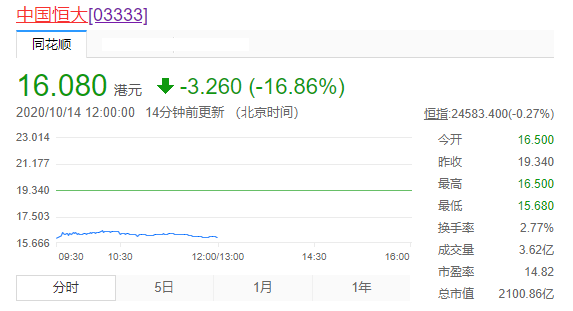 受到折让价格过大的影响,恒大今日开盘股价大跌,跌幅最高超过16%后逐步收窄。截至午间收盘,中国恒大股价报16.08港元/股,跌幅达16.86%。