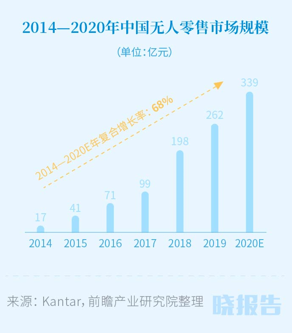 在2014到2020年间,复合增长率也达到了68%。其中,自助售货机是主流渠道,占据了85%的市场份额。