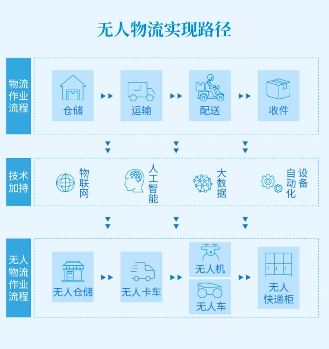 简单来说,无人物流就是快递全程无人运送,整个物流的实现路径大家可以来看下图。