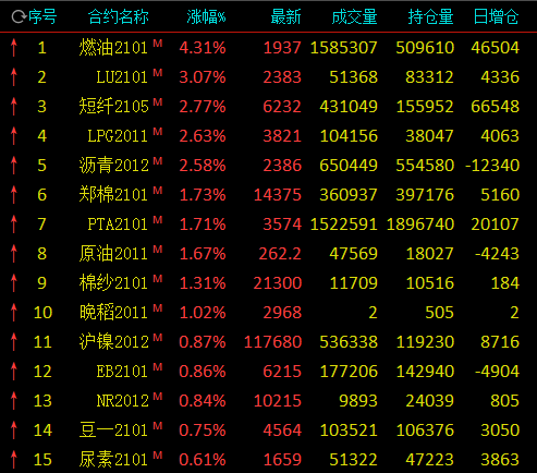 热点栏目10月15日,国内期市早盘涨跌不一,能化品多数上涨,燃油涨逾4%,低硫燃油涨逾3%,短纤、LPG、沥青涨逾2%,原油、PTA涨近2%;黑色系走跌,铁矿石跌近2%,热卷、动力煤跌逾1%;农产品分化,棉花涨近2%,鸡蛋跌逾2%。