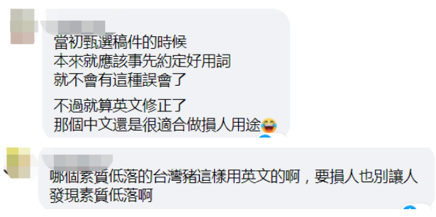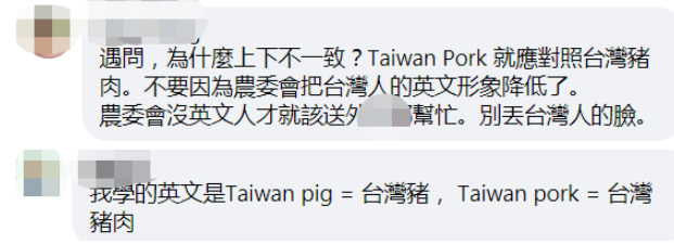 还有岛内网友讽刺“农委会”,就算修正了英语,中文还是“台湾猪”,“很适合损人用”。↓