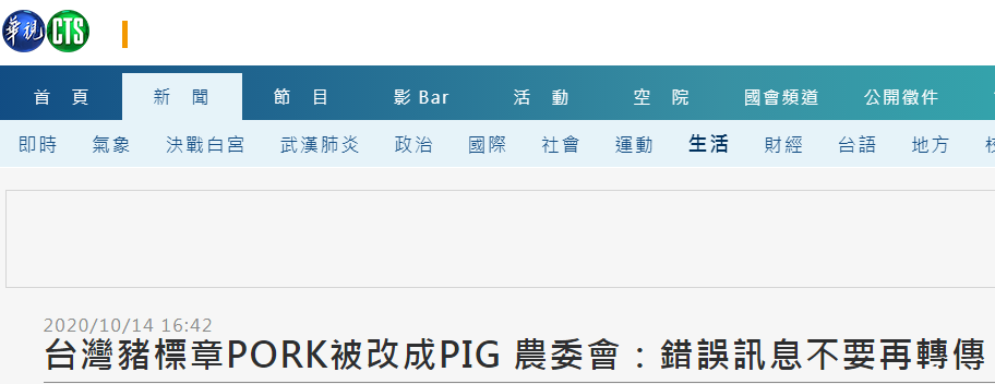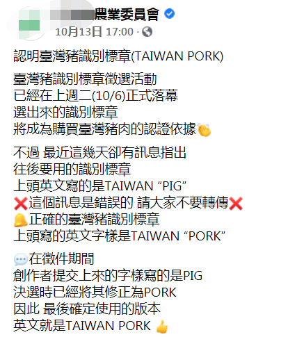 民进党当局“农委会”在13日在脸书发文称,创作者当初提交上来的字样写的确是“PIG”,但最终已经将其修正为“PORK”,因此最后确定使用的版本英文就是“TAIWAN PORK”。“农委会”还呼吁大家不要再转传错误讯息。