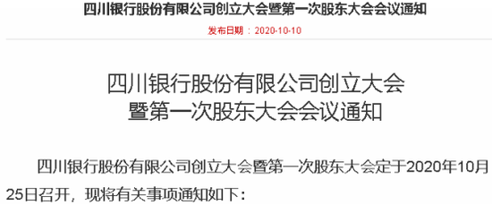 10月10日,作为组建四川银行的两家班底银行,攀枝花市商业银行、凉山州商业银行同日发布《四川银行股份有限公司创立大会暨第一次股东大会会议通知》。通知显示,会议地点位于成都天投万怡酒店,参会人员包括股东、董事、监事及高级管理人员候选人、四川银行股份有限公司筹备组成员等。根据议程,本次会议还将审议十三项议程,包括四川银行筹建工作报告、选举第一届董事会董事成员、选举第一届监事会股东监事及外部监事成员。