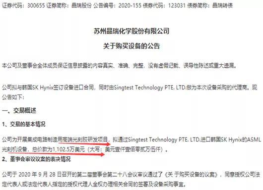 如上文提到,阿斯麦的4台EUV设备价值5.95亿欧元,按当前汇率折算成人民币,就是每一台光刻机价值11.7亿元人民币。就在前不久,在A股上市的晶瑞股份就曾公告以1102.5万美元(约合0.74亿元人民币)进口韩国SK Hynix的ASML光刻机设备。