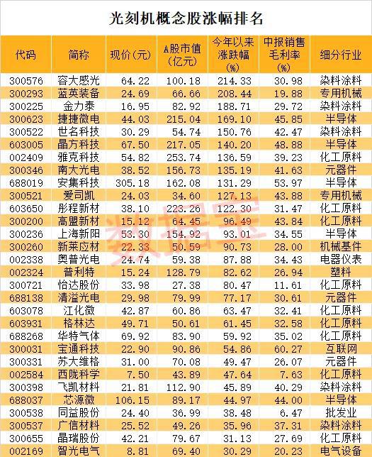11只光刻机概念股涨幅翻倍