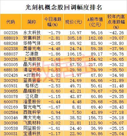 不过与年内高点相比,光刻机概念股整体回调力度不小。据统计,11股最新收盘价较年内高点回调30%以上,分别是永太科技、安集科技、华特气体、奥普光电、芯源微等。其中永太科技回调幅度最大,该股于2月初创下年内高点,迄今回调42.26%。
