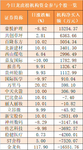 盘后龙虎榜数据显示,机构现身20股,其中豪悦护理等11股呈现机构资金净买入,金龙鱼等9股呈现机构资金净卖出。