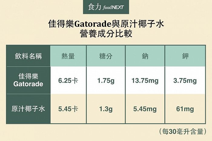 椰子水相对专业运动饮料,在钠元素上差距较大,含糖量并未低多少。来源:FOODNEXT食力