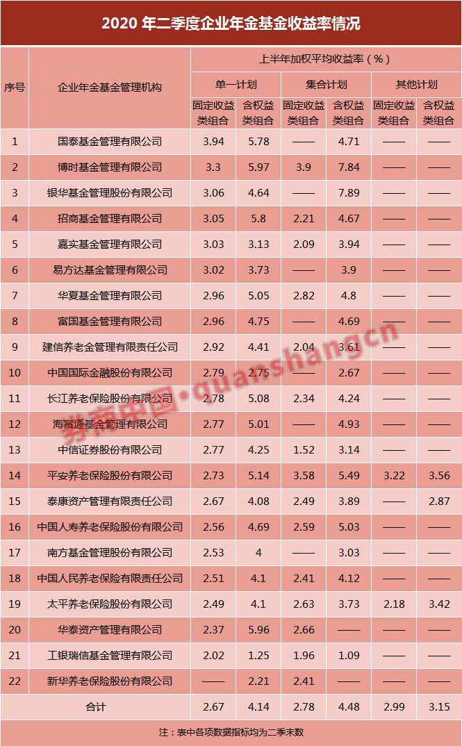 具体来看,单一计划方面,在固收类组合中,国泰基金上半年加权平均收益率位列第一,为3.94%;其次是博时基金和银华基金,分别为3.30%和3.06%;在含权益类组合中,上半年业绩表现最好的是博时基金,加权平均收益率为5.97%,其次是华泰资产和招商基金,加权平均收益率分别为5.96%和5.80%。