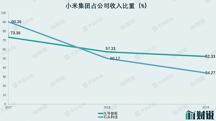 可以看到,石头科技来自小米的收入占比,从2017年的90.36%快速下降到2019年34.27%。而九号智能来自小米的收入占比,从2017年73.36%下降到2019年的52.33%,仍占据半壁江山。