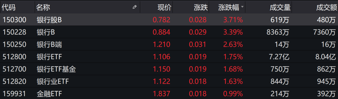 今日,银行板块表现较为强势,申万银行行业以1.70%的涨幅位居申万一级行业涨幅榜首位。场内银行主题基金悉数飘红,其中,银行股B(150300.SZ)、银行B(150228.SZ)涨幅超过3%,银行B端(150250.SZ)涨幅超过2%。