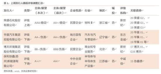 本周4家发行人及其发行债券发生跟踪评级调整,1家上调,3家下调。上周评级一次性下调超过一级的发行主体:华晨汽车集团控股有限公司、博天环境集团股份有限公司、保利协鑫(苏州)新能源有限公司。
